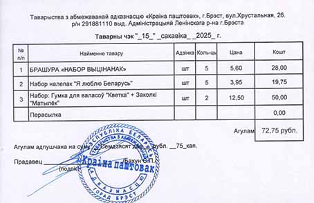 Таварны чэк, у якім пазначаныя пералік найменняў і сума заказу.